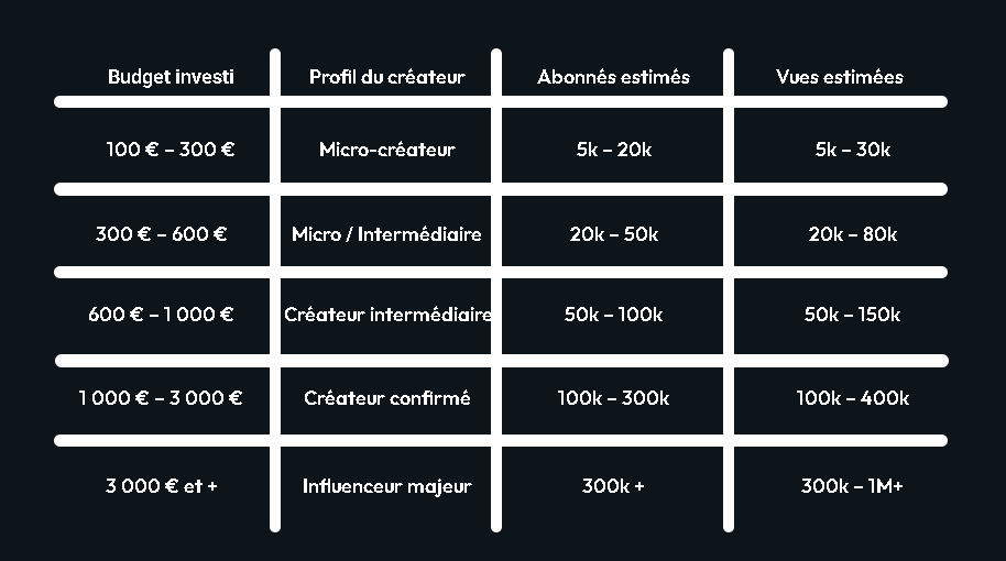 Les performances d’un contenu ne peuvent être garanties à l’avance. C’est pourquoi TRUSTY s’appuie sur les statistiques historiques des créateurs, leur régularité et leur engagement pour établir des fourchettes réalistes.