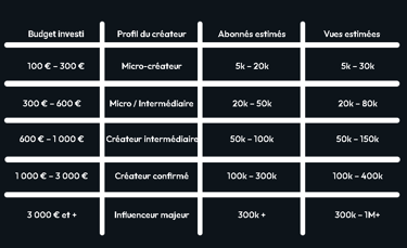 Les montants ci-dessous sont donnés à titre indicatif, sur la base des pratiques observées sur le marché et des performances moyennes des créateurs.